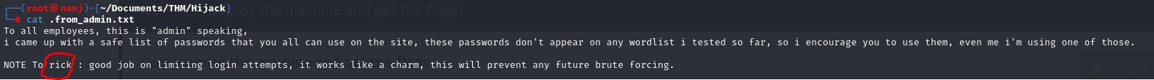 we got another username from “from_admin.txt”. The really smart “admin” said I came up wit ha safe list of passwords, AAHAHA safe, so it sounds passwords_list.txt is juicy. Lets go!