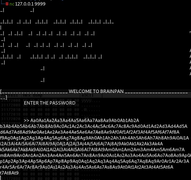 [______________________ WELCOME TO BRAINPAN ______________________]Then it prompts:ENTER THE PASSWORD