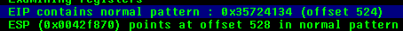 The output tells us that EIP was overwritten at offset 524 in the input pattern. This is the exact position in our buffer that will allow us to take control of the program’s execution flow.
