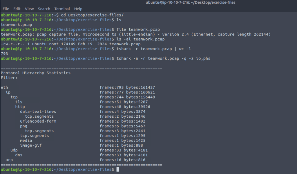 To begin analyzing the teamwork.pcap file, we first need to understand the distribution of protocols within the capture. This can be done by viewing the Protocol Hierarchy Statistics (PHS). To do this, run the following command: