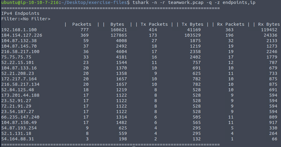 tshark -n -r teamwork.pcap -q -z endpoints,ip