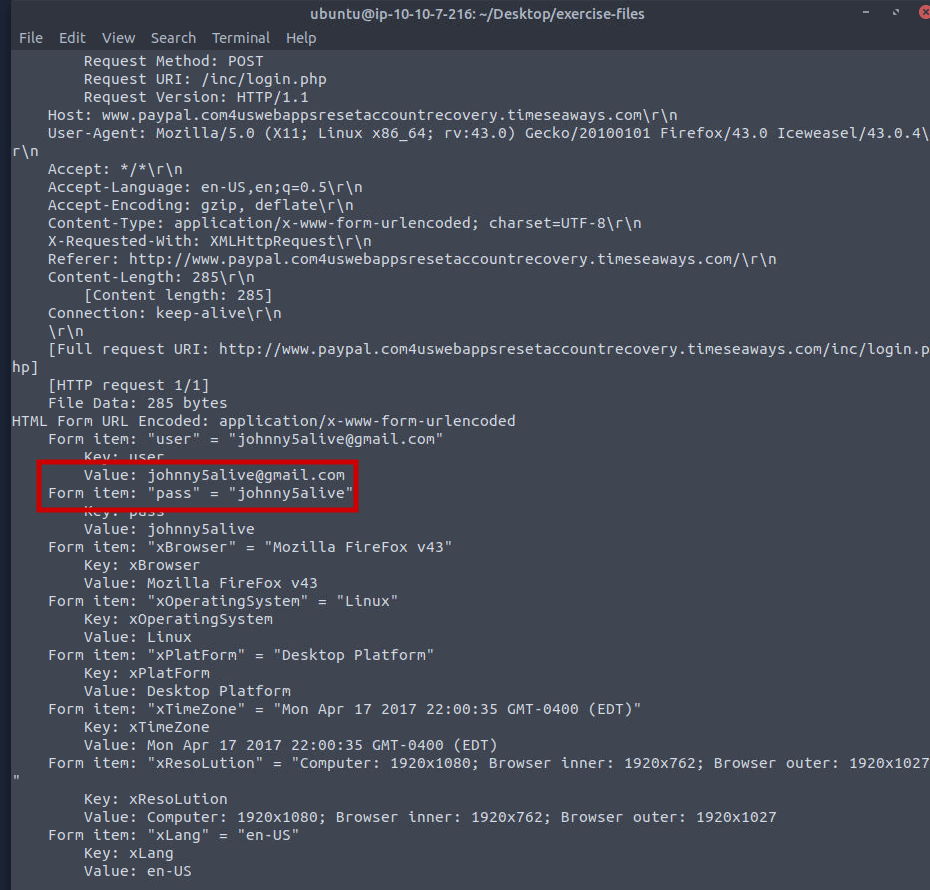 Upon further inspection of the POST request, we can see the user’s submitted email and password, confirming that the user fell victim to a PayPal phishing scam.