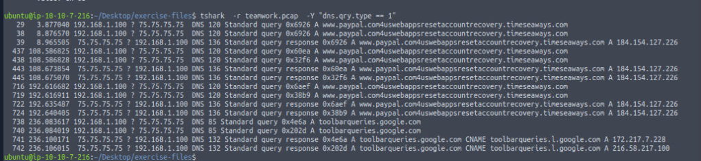 tshark -r teamwork.pcap -Y "dns.qry.type == 1"