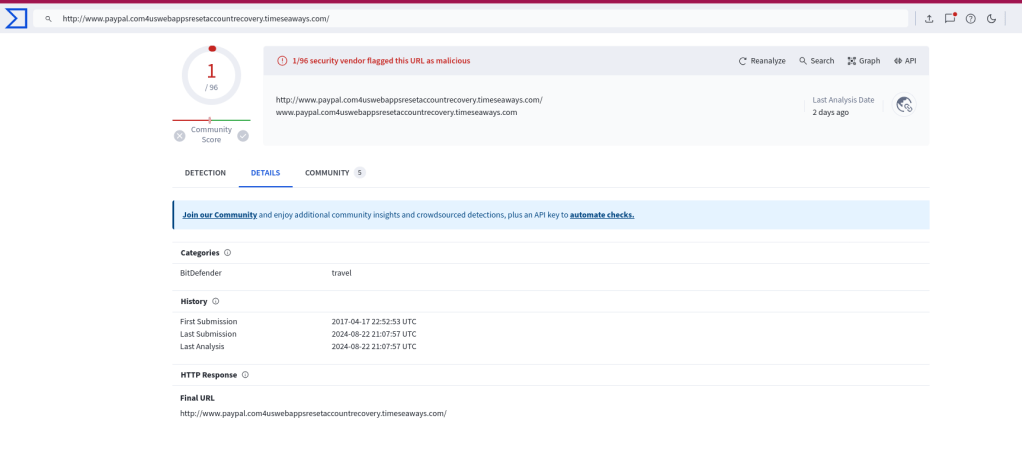 This confirms that the URL we discovered has also been reported in VirusTotal as associated with a phishing email.