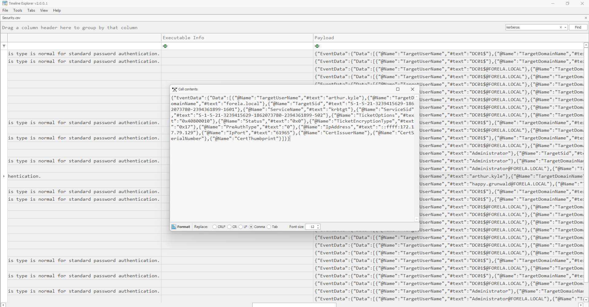 Let’s begin the investigation. First, we will parse the Security.evtx file to a CSV format using EvtXCmd.exe, and then open it in TimelineExplorer.